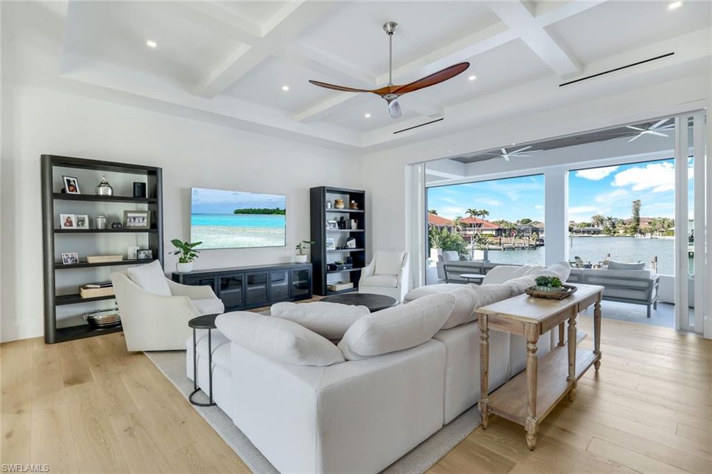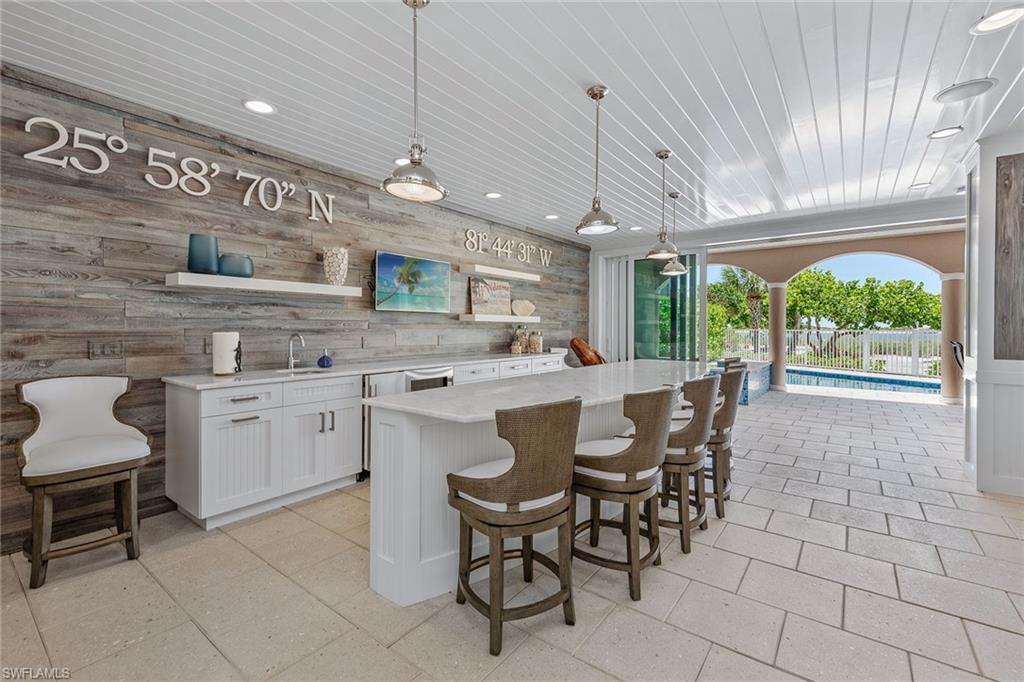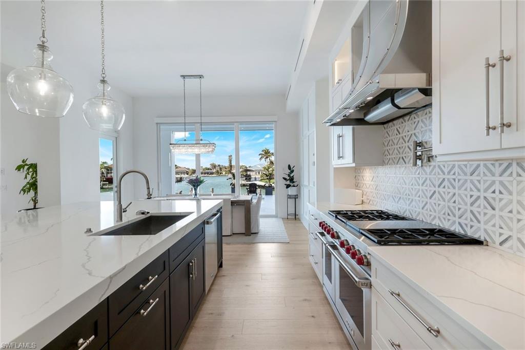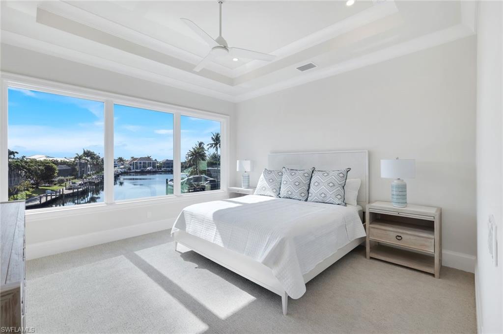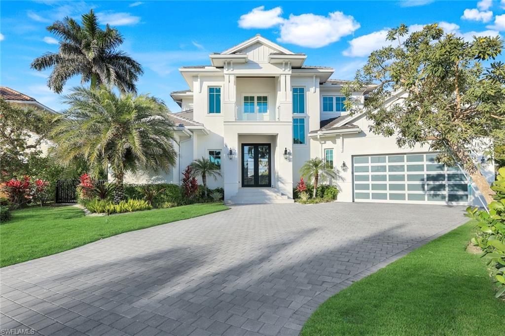Luxurious, new, custom-built home on a .5-acre lot with southern exposure and stunning wide water views overlooking Fredericks Bay. In mint condition, this home has designer finishes throughout and features four bedrooms plus a large office/den, five full baths, resort-style pool plus integrated spa, elevator, four-car garage (one with air conditioning) with additional room for lifts, 60,000-pound boat lift and two platform lifts for jet skis and a tender. Chef-style kitchen with Sub-Zero & Wolf appliances, custom cabinetry, quartz counters, designer fixtures and a walk-in pantry. Adjacent to the kitchen is a fabulous dining area with a built-in wet bar and an oversized Sub-Zero wine cellar. Expansive great room with soaring ceilings, built-ins, intricate ceiling details and views in every direction. Designed with a coastal lifestyle in mind, the home has sliding pocket doors to optimize for seamless indoor/outdoor living. Outdoor entertaining is made easy with a custom bar/summer kitchen, sprawling lanai, fireplace and hurricane shutters plus electronic screens. Primary bedroom on the first floor with dual closets and spa-like bathroom with dual shower heads and soaker tub. The second floor has a great room with incredible bay views, three sizable bedrooms, three full baths, a bar and large lanai. Other features include wide plank white oak flooring throughout, Uxari Home Security System, elevator, laundry room with two full-size washer and dryers, sink, ample storage and a generator. Direct access out to the Gulf in just minutes. Island living is calling your name!