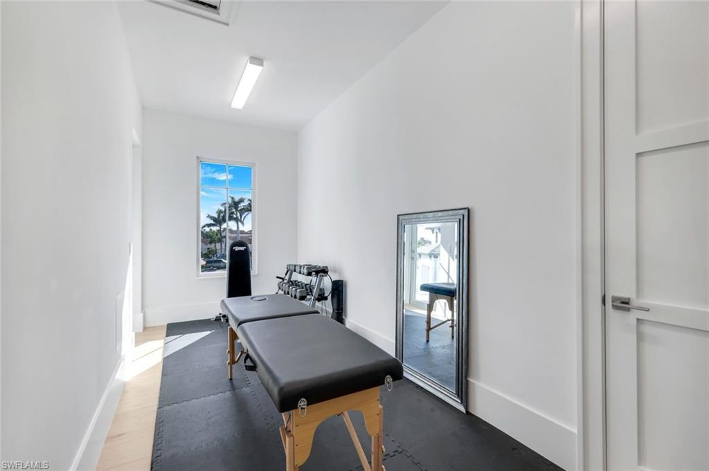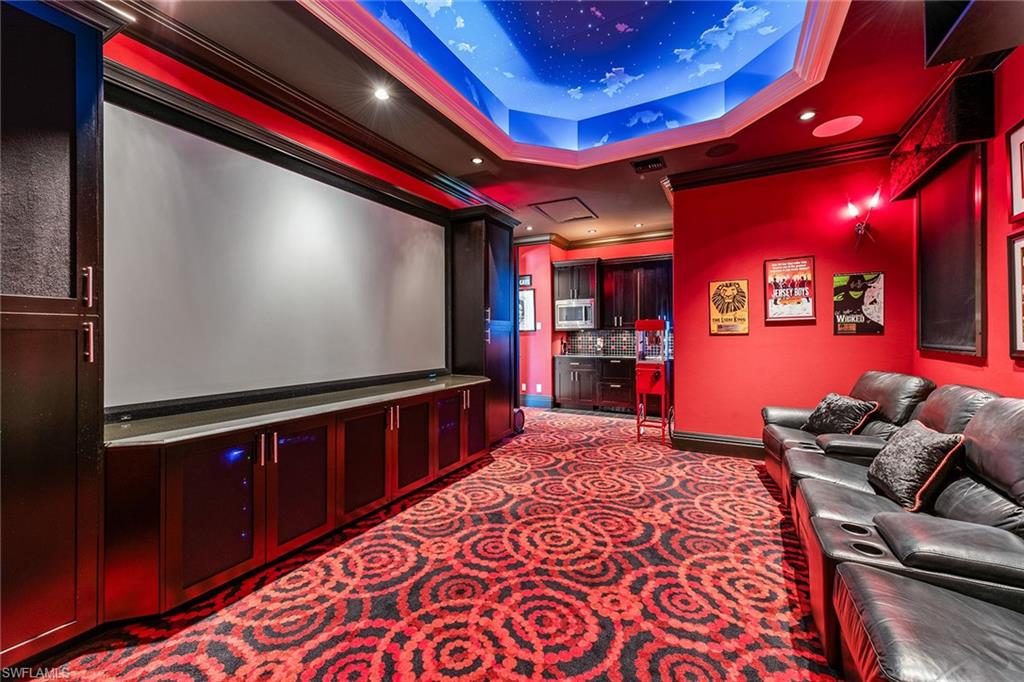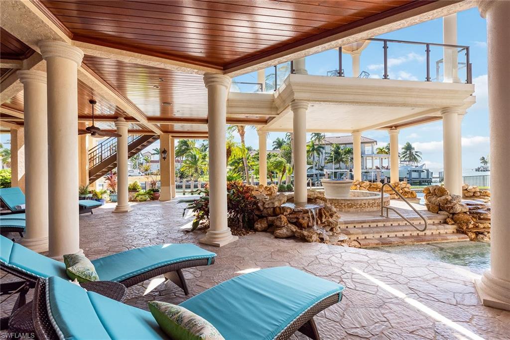 On the south side of Caxambas Court in Marco Island's prestigious Estates neighborhood, this exceptional three-story waterfront estate epitomizes luxury coastal living. Boasting 125 feet of deep-water frontage, the property offers direct Gulf access and panoramic southern views, further enhanced by a unique fourth-floor observation deck. Encompassing 6,370 square feet of air-conditioned space and totaling 11,679 square feet under roof, this residence features five bedrooms, an office, a theater, and five full and two half baths, all meticulously designed with the finest materials and craftsmanship. Inside, soaring coffered ceilings, intricate three-piece crown molding and travertine flooring create an atmosphere of refined elegance. The gourmet kitchen is a chef’s dream, equipped with custom wood cabinetry, granite countertops, dual center islands, a seven-seat breakfast bar and top-of-the-line JennAir appliances, including a six-burner gas range and double wall ovens. The great room features a mosaic tile accent wall, built-in gas fireplace and custom bookcases, seamlessly connecting to the expansive lanai through glass sliders. The owner's suite serves as a private sanctuary, offering a tray ceiling, walk-in closet and a spa-like en-suite bath with dual custom vanities, an open walk-in shower with multiple heads, a jetted soaking tub and dual water closets with a bidet. Each guest suite is thoughtfully appointed with tray ceilings, walk-in closets and en-suite baths, ensuring comfort and privacy for all. The state-of-the-art theater room, complete with a wet bar, surround sound and built-in projector cabinetry, provides an ideal space for entertainment. The exterior is equally impressive, featuring a fully fenced backyard, four balconies, impact-resistant doors and windows, and a stamped concrete circular driveway. The outdoor living area includes a heated saltwater pool with spa, an outdoor kitchen equipped with a Fire Magic gas grill and mini refrigerator, and a gas fire pit surrounded by a tranquil fountain. Boating enthusiasts will appreciate the private composite dock with a captain’s walk, two Hi-Tide boat lifts and a 40-foot slip with provisions for a 30,000-pound lift, offering unparalleled access to the Gulf. Modern conveniences abound, including a private elevator, in-ceiling speakers, a video security system, Honeywell 240V central vacuum, two Rinnai tankless water heaters, a Generac 48-kilowatt whole-home generator and a 1,000-gallon propane tank. The six-car air-conditioned garage is outfitted with built-in storage cabinets, a workbench and a gym area, catering to automotive enthusiasts and fitness aficionados. This remarkable estate seamlessly blends luxury, comfort and cutting-edge technology, offering an unparalleled coastal lifestyle in one of Marco Island’s exclusive enclaves.