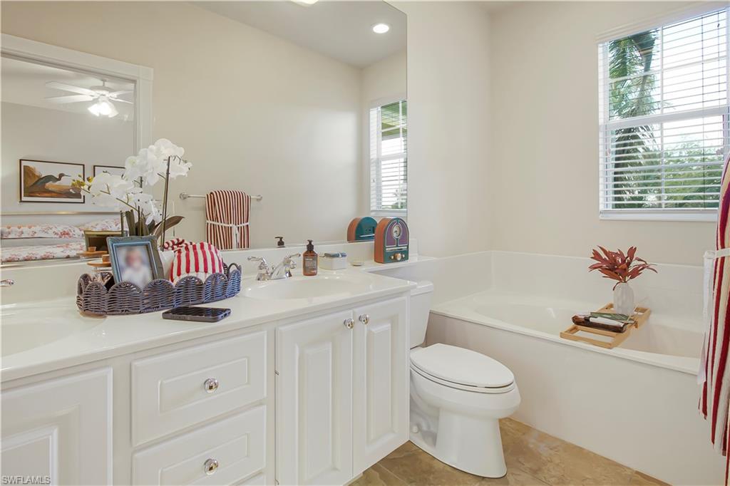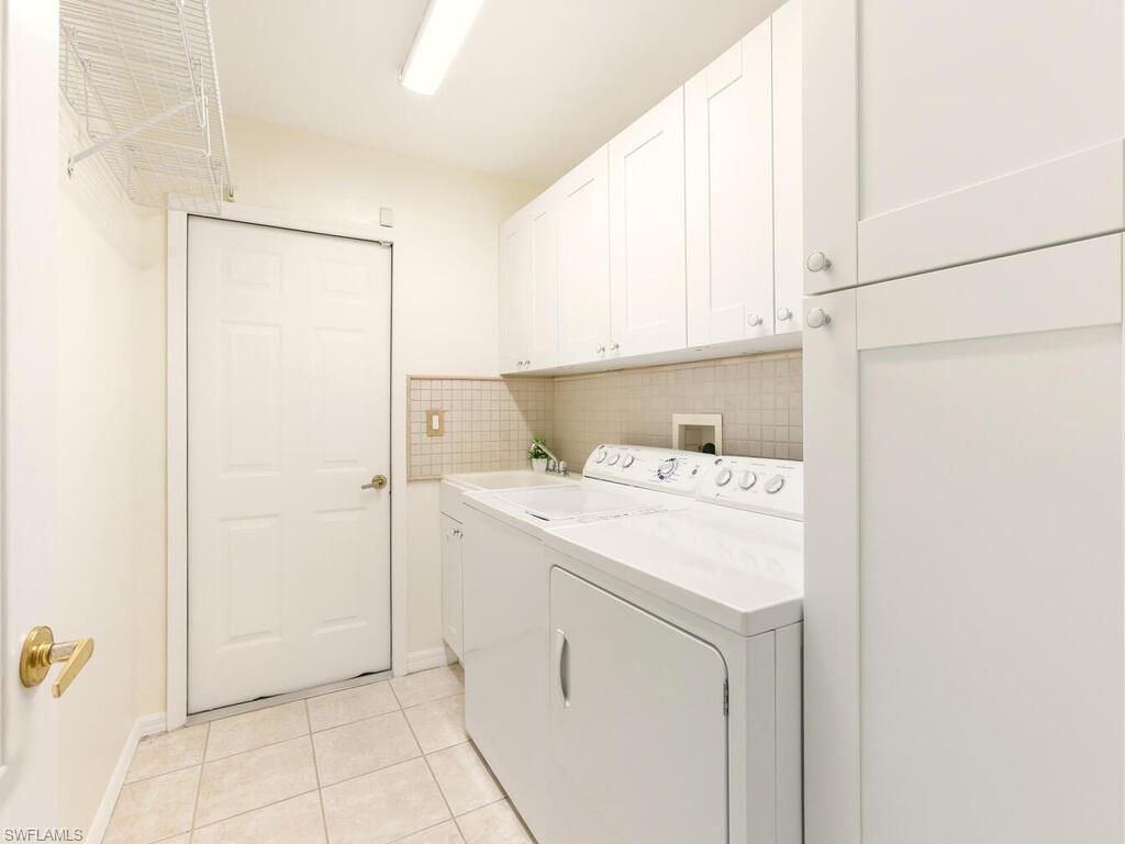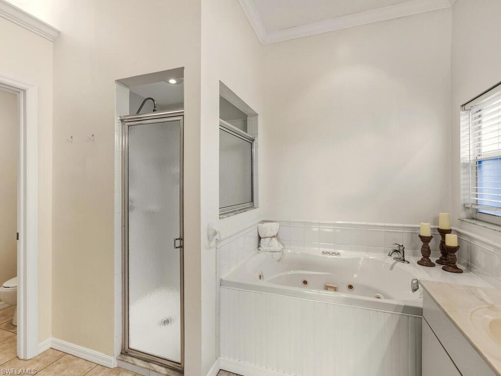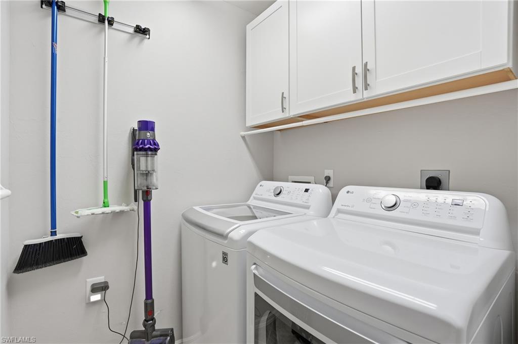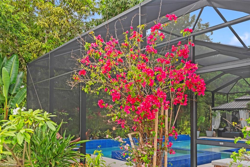 Step into this bright, sun-filled home featuring soaring vaulted ceilings and an open-concept layout that’s perfect for modern living. The spacious kitchen welcomes you with abundant cabinetry, Whirlpool oven, dishwasher, microwave, and a convenient laundry room just steps away—complete with a Samsung washer and dryer, laundry sink, and generous shelving and storage. From the laundry area, access the oversized two-car garage offering built-in cabinets, attic storage, two windows for natural light, and a side door for easy exterior access. The moment you enter the home, you’re greeted by a seamless kitchen/living/dining space that flows out to a magnificent screened-in pool area. Enjoy effortless indoor–outdoor living with sliders leading to a pool deck spacious enough for both a full dining setup and a relaxing lounge area. To the left of the entry, two generously sized guest bedrooms share a well-appointed Jack-and-Jill bathroom with tub/shower combo, great closet space in each room, and a hallway linen closet for added convenience. On the opposite side, the private primary suite awaits—complete with windows flanking the bed, its own slider to the pool, and a luxurious bath featuring a jetted soaking tub, separate shower, bidet, and elegant tile flooring. Sunshine fills every corner of this serene retreat. The home also offers a dedicated pool bath—perfect for entertaining. All of this and literally four short miles to the most pristine beaches, close to Mercato, restaurants and the most wonderful nightlife that Southwest Florida can offer. Are you still waiting? Outside, enjoy a beautiful yard with mature landscaping that enhances both privacy and curb appeal.
