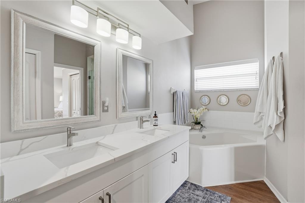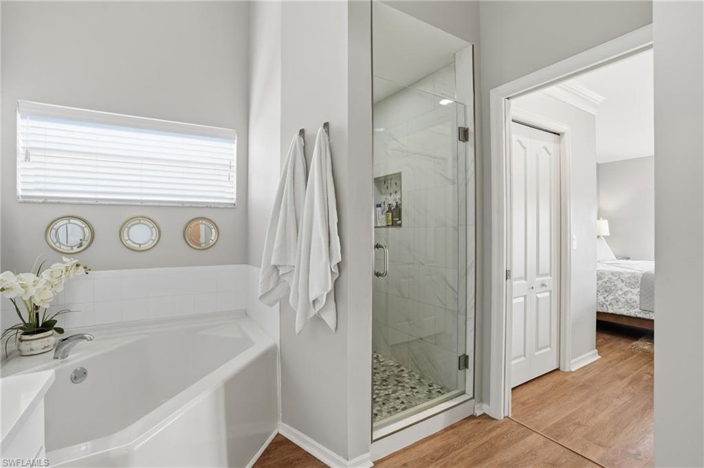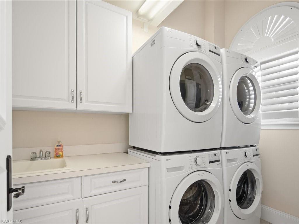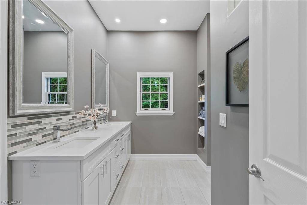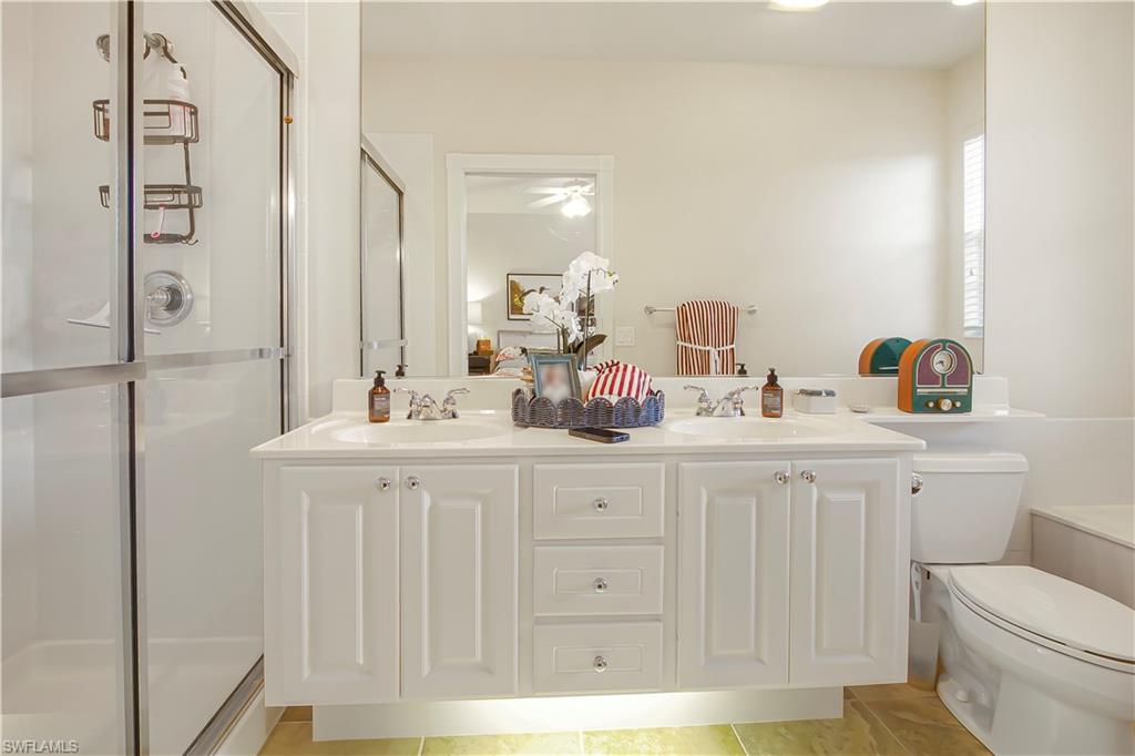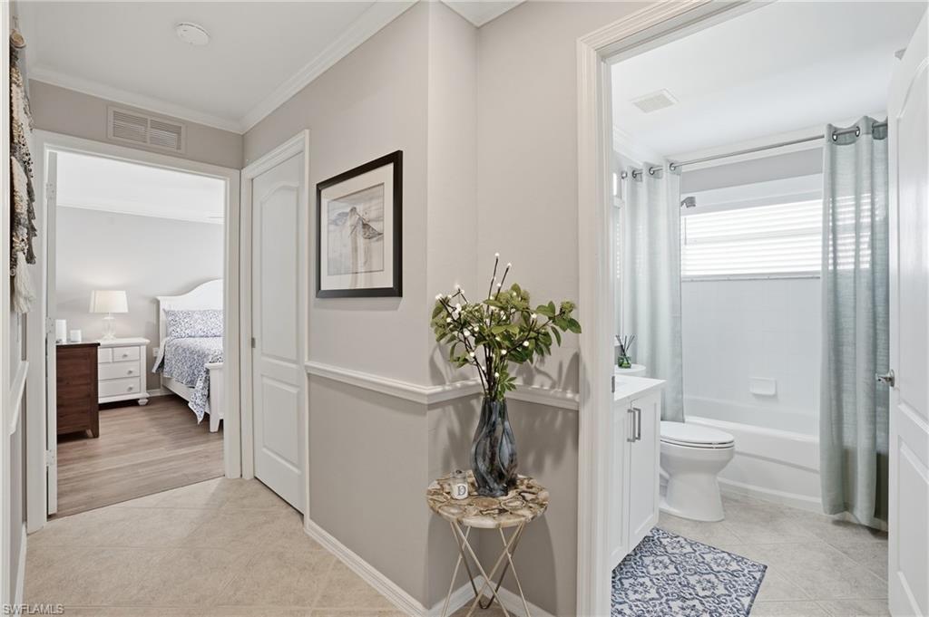 Step into this bright, sun-filled home featuring soaring vaulted ceilings and an open-concept layout that’s perfect for modern living. The spacious kitchen welcomes you with abundant cabinetry, Whirlpool oven, dishwasher, microwave, and a convenient laundry room just steps away—complete with a Samsung washer and dryer, laundry sink, and generous shelving and storage. From the laundry area, access the oversized two-car garage offering built-in cabinets, attic storage, two windows for natural light, and a side door for easy exterior access. The moment you enter the home, you’re greeted by a seamless kitchen/living/dining space that flows out to a magnificent screened-in pool area. Enjoy effortless indoor–outdoor living with sliders leading to a pool deck spacious enough for both a full dining setup and a relaxing lounge area. To the left of the entry, two generously sized guest bedrooms share a well-appointed Jack-and-Jill bathroom with tub/shower combo, great closet space in each room, and a hallway linen closet for added convenience. On the opposite side, the private primary suite awaits—complete with windows flanking the bed, its own slider to the pool, and a luxurious bath featuring a jetted soaking tub, separate shower, bidet, and elegant tile flooring. Sunshine fills every corner of this serene retreat. The home also offers a dedicated pool bath—perfect for entertaining. All of this and literally four short miles to the most pristine beaches, close to Mercato, restaurants and the most wonderful nightlife that Southwest Florida can offer. Are you still waiting? Outside, enjoy a beautiful yard with mature landscaping that enhances both privacy and curb appeal.