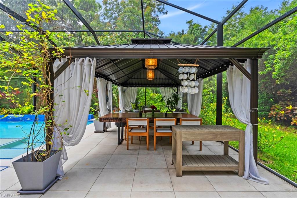 Discover a truly one-of-a-kind Naples retreat, a custom estate offering a luxurious pool home, a private guest house, and a large boat house on nearly two acres of beautifully landscaped grounds. Ideally located near I-75 and only a short drive from Fifth Avenue’s premier shopping, white-sand beaches, dining, and entertainment, this residence blends luxury, privacy, and exceptional versatility. Its thoughtfully designed layout divides the total living space between the main residence and a fully independent guest home. Of the home’s five bedrooms and five bathrooms include two bedrooms and two bathrooms in the guest house, providing complete privacy between dwellings. This setup is ideal for adult children, aging parents, multigenerational living, or income generation. The updated main house welcomes you with an open-concept design perfect for entertaining. The living room features 16-foot vaulted ceilings and a striking stone fireplace. The gourmet kitchen includes statement granite countertops, a large island, wet bar, wine refrigerator, and premium Jenn-Air appliances. The adjacent dining area adds a dry bar and an additional wine refrigerator for effortless hosting. Glass doors open to an elevated screened-in lanai with luxurious porcelain pavers that flow onto the pool deck. A custom heated saltwater pool anchors the outdoor oasis, complete with waterfalls, sun shelf, 360-degree champagne-spillover spa, bubblers, and ambient lighting. A cabana-style dining and lounge area with market lighting and lush accents enhances the relaxing atmosphere. The main residence offers three bedrooms, including a spacious primary suite with a custom walk-in closet and a spa-inspired bathroom featuring a large rain shower. A dedicated office or den, two remodeled full bathrooms, and a pass-through three-car garage complete the main home. The guest house provides its own kitchen with skylight and granite countertops, vaulted ceilings, a sunroom, two bedrooms, two bathrooms, and a private one-car garage, making it perfect for family, guests, or rental income. At the rear of the property, a modern workshop and boat storage building measuring approximately 20 by 36 feet with a 16-foot ceiling, roll-up door, and LED lighting adds exceptional functionality, with convenient access via 58th Street SW. The grounds offer seclusion and tropical beauty, featuring mango, avocado, and banana trees, along with mature bamboo that creates a lush, botanical-garden feel. This remarkable Naples estate offers serene, private living with unmatched flexibility, all just minutes from downtown. Opportunities like this are truly rare.