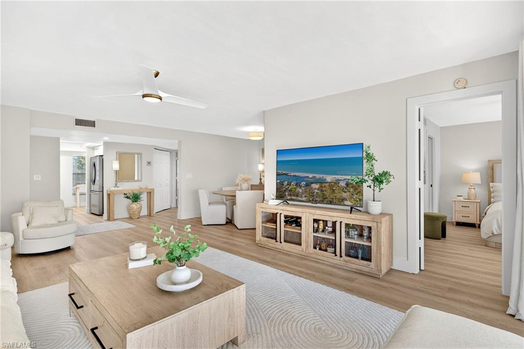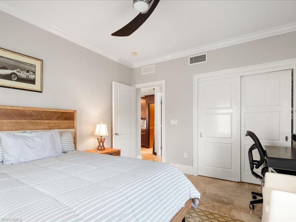 Poised above the vibrant charm of Third Street South, two hundred ninety-two Fourteenth Avenue South, Residence F offers an elegant retreat within the coveted Pettit Square enclave, where modern design and effortless Old Naples living blend seamlessly. This sophisticated three-bedroom corner residence captures radiant natural light throughout, enhanced by volume ceilings, refined crown molding, and expansive balconies that invite tranquil views of the surrounding boutiques, galleries, and courtyards. An open great room layout creates an inviting flow for daily living and elevated entertaining, anchored by tile flooring and integrated upgrades including a Leviton smart home network and whole-home audio wiring. The gourmet kitchen is fashioned with custom cabinetry, polished granite surfaces, stainless steel appliances, and a distinctive glass-accented breakfast bar that enhances both function and style. The generous primary suite provides a serene private retreat with its own balcony overlooking the lush courtyard, a thoughtfully designed storage and laundry area, and a beautifully finished bath appointed with a frameless glass walk-in shower. Two additional guest suites, each with a private balcony, offer welcome comfort and privacy within the split-bedroom layout. Impeccably maintained and offered in exceptional condition, the residence features meaningful enhancements such as impact-rated windows and doors, a newer HVAC system and water heater, updated shower enclosures, and contemporary ceiling fans. With a premier location moments from renowned dining, upscale shopping, and the iconic sugar-sand shoreline, this furnished residence captures the essence of refined coastal living in the heart of Old Naples. Experience an address that elevates lifestyle at every turn and discover the rare opportunity to own one of Pettit Square’s most distinguished offerings.