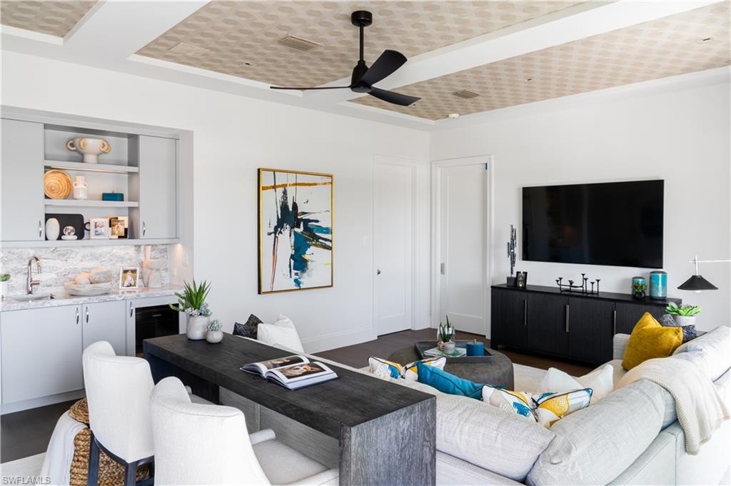 Now Completed! This extraordinary estate, masterfully designed by Stofft Cooney Architects, constructed by the esteemed A. Vernon Allen Builders, and exquisitely curated by Finding Sanctuary, offers nearly 8,200 square feet of refined, air-conditioned living space. Inside, five en suite bedrooms provide luxurious comfort, including a private guest retreat with its own lounge and a flexible gym with a full bath—ideal for conversion into a sixth bedroom if desired. The expansive first-floor master suite is paired with an oversized office/clubroom, perfect for work or unwinding in style. The residence features three laundries, 80kW whole-home generator. Designed for both relaxation and grand entertaining, the outdoor living space is truly exceptional. A rear patio fully enclosed by motorized screens and shutters allows for year-round enjoyment, while the resort-style pool with swim-up bar invites ultimate leisure. Take in stunning western sunsets over Smuggler’s Bay from the spa or expansive covered terrace. A true haven for self-proclaimed sommeliers, the home includes a walk-in wine cellar, perfect for storing and showcasing your finest vintages. Car enthusiasts will appreciate the five-bay garage, tailored for prized collections. This is an immediate Port Royal membership eligible property—offering not just a home, but an unparalleled lifestyle in one of Naples’ most coveted communities.